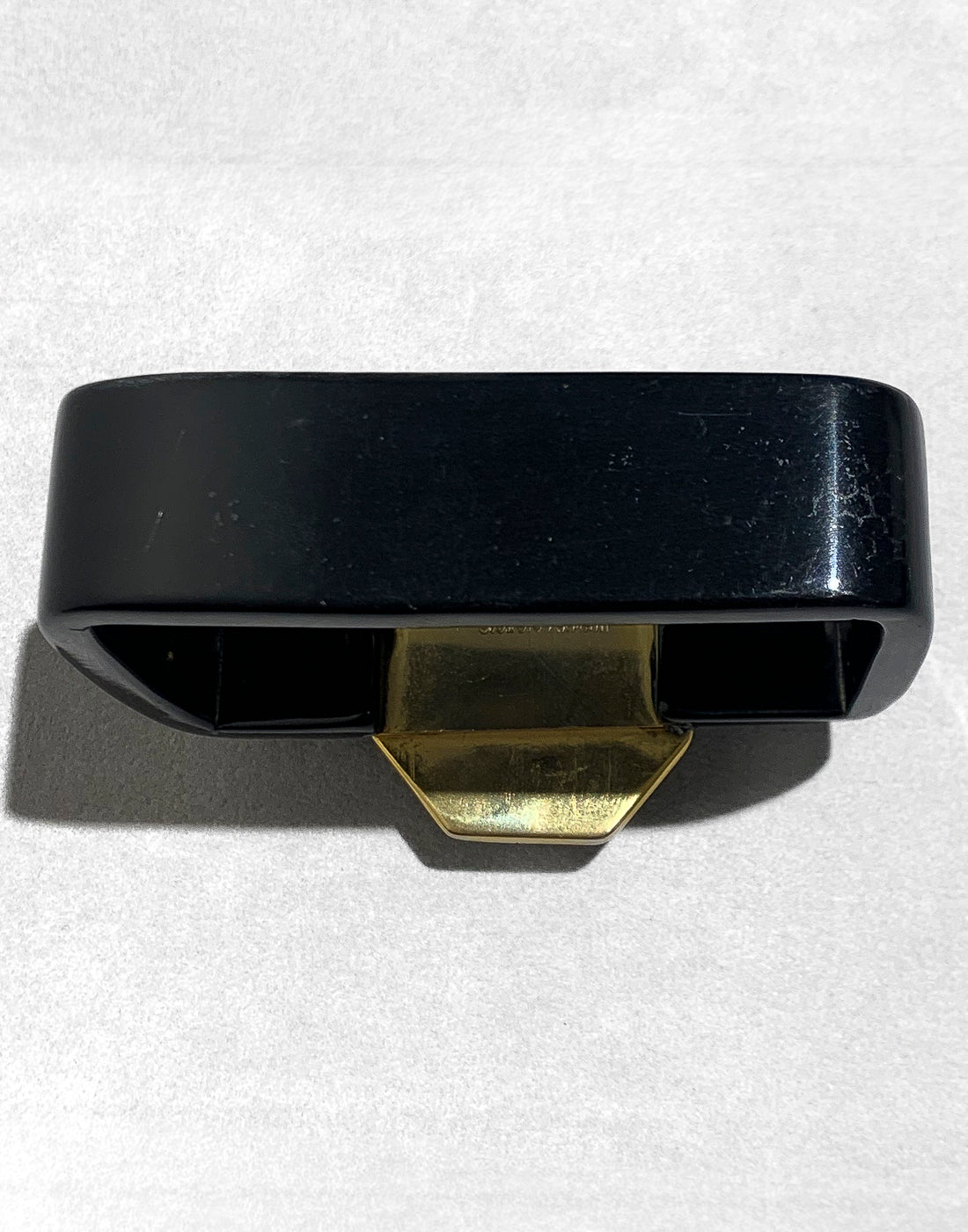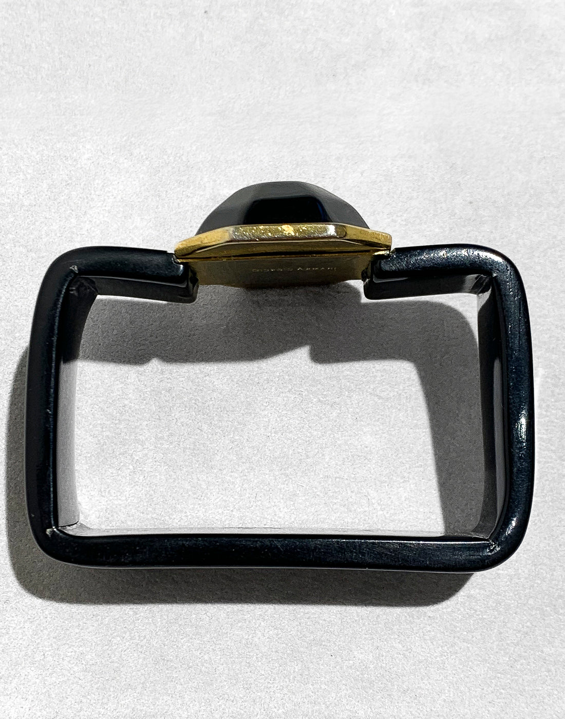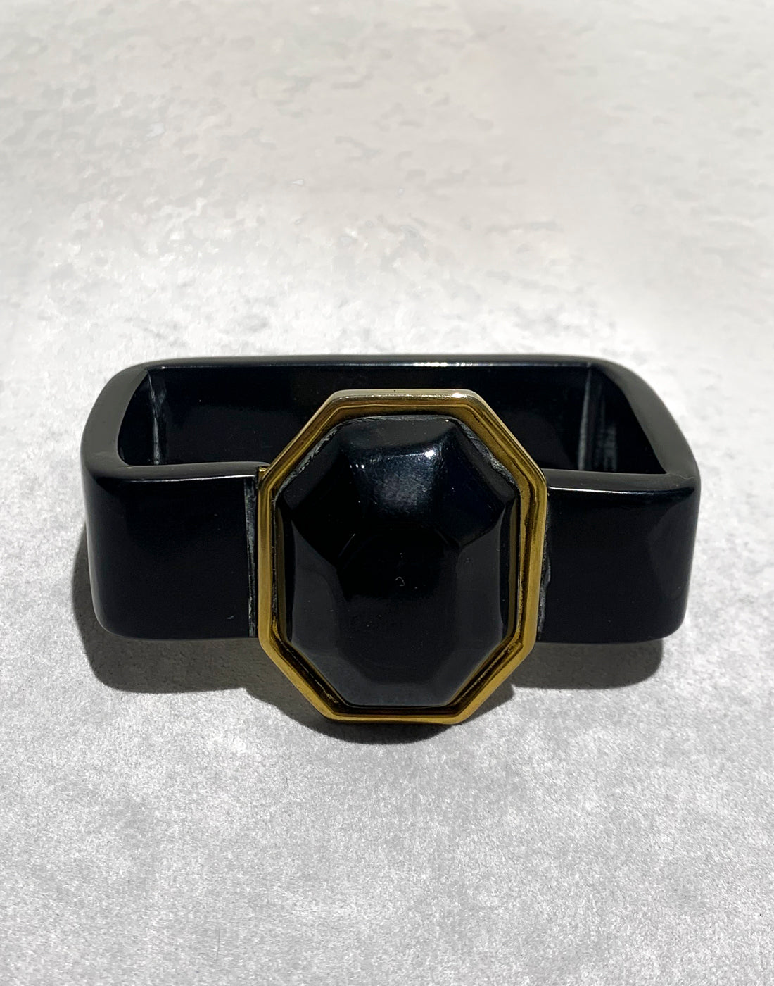 Statement Giorgio Armani - made by Sharra Pagano - rectangular rigid bracelet with large faceted stone. It was made in Italy in 1990. It's black and with a gilt metal bezel. A rare and beautiful jewellery piece.