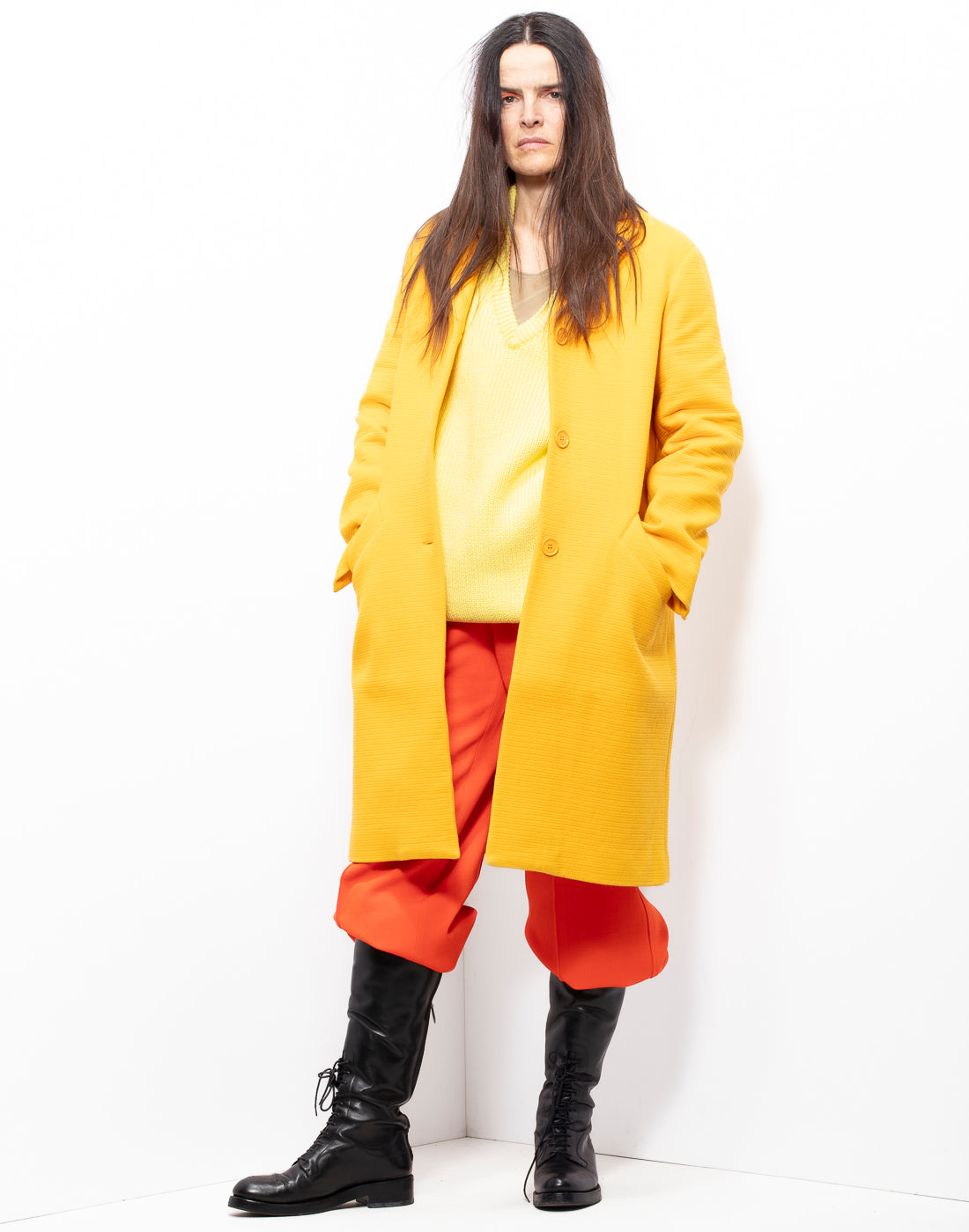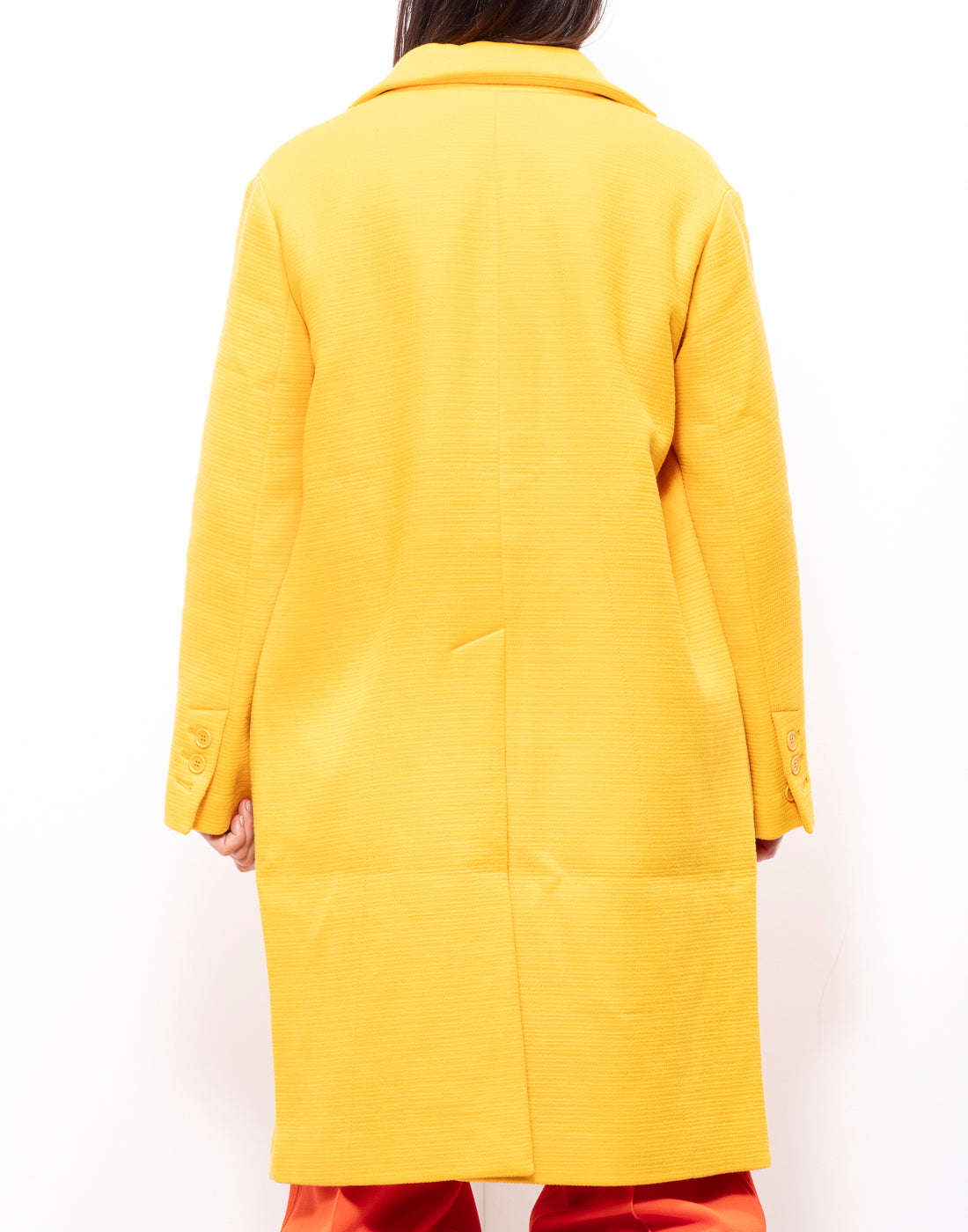 This is a beautiful bright yellow coat by Nina Ricci. It's in heavy cotton fabric (68% cotton and 32% polyamide). It features cute round buttons with logo on them.