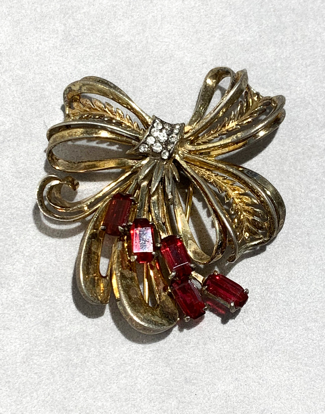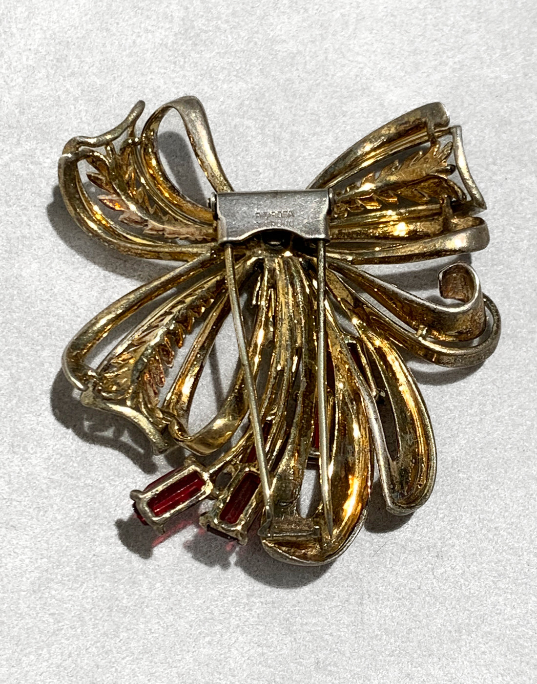 Beautiful and timeless 1950's brooch designed by Ralph de Rosa - USA. Gilded sterling silver, rhinestones and red glass stones. It's an elegant accessory that will up-scale your look.