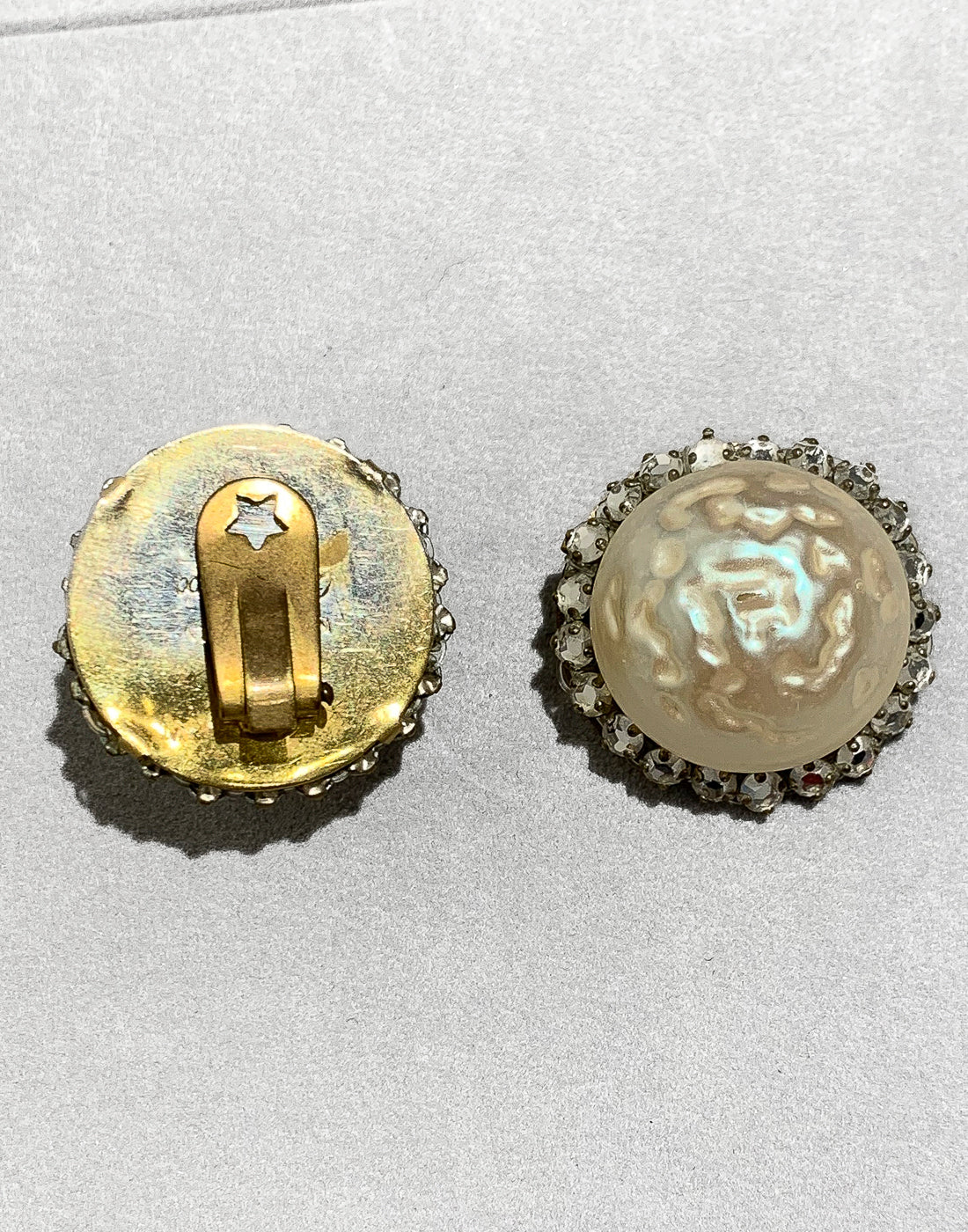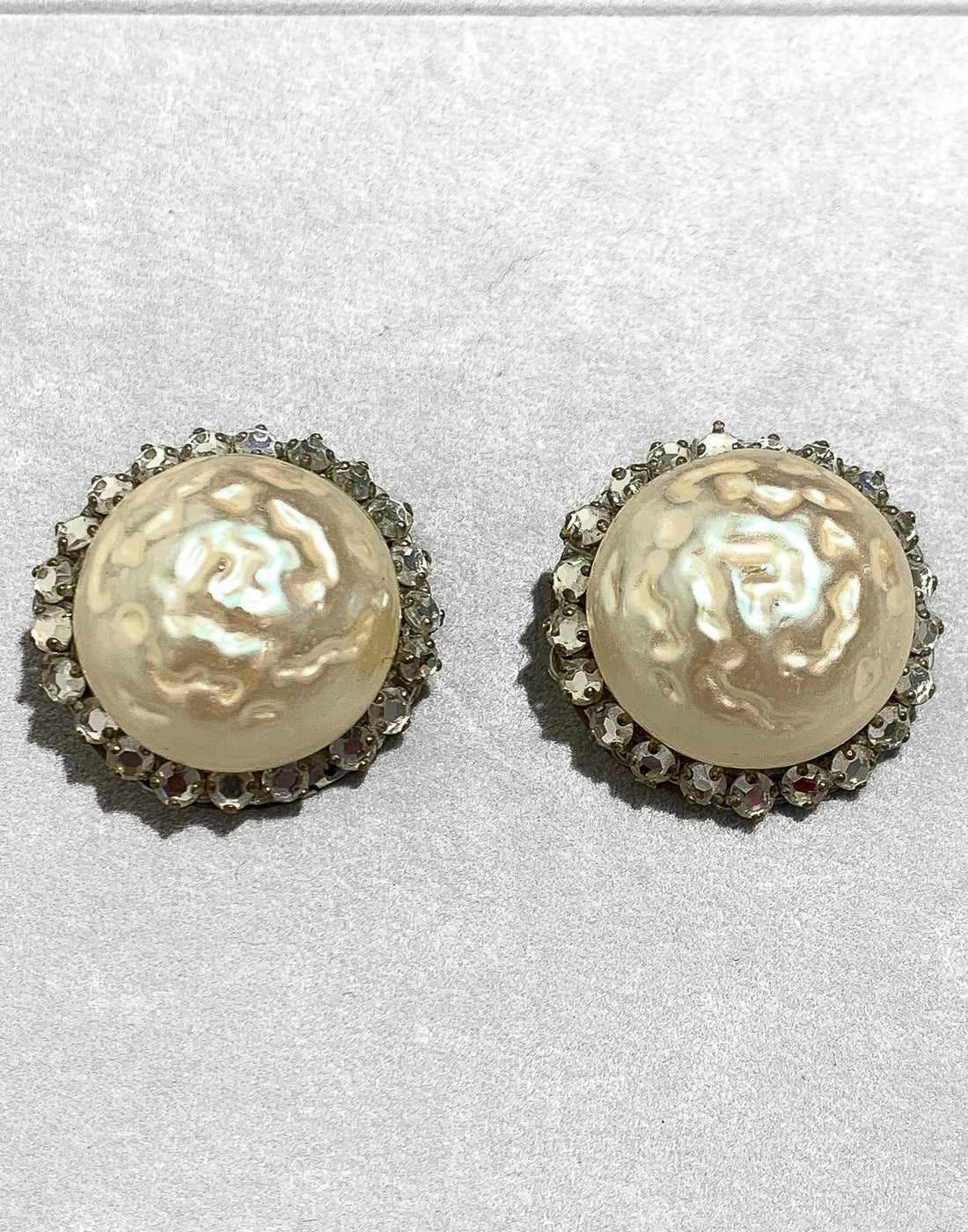 Timeless Button Earrings from 1965 designed by Coppola & Toppo. Simulated pearls and roses montees on gilded metal base.