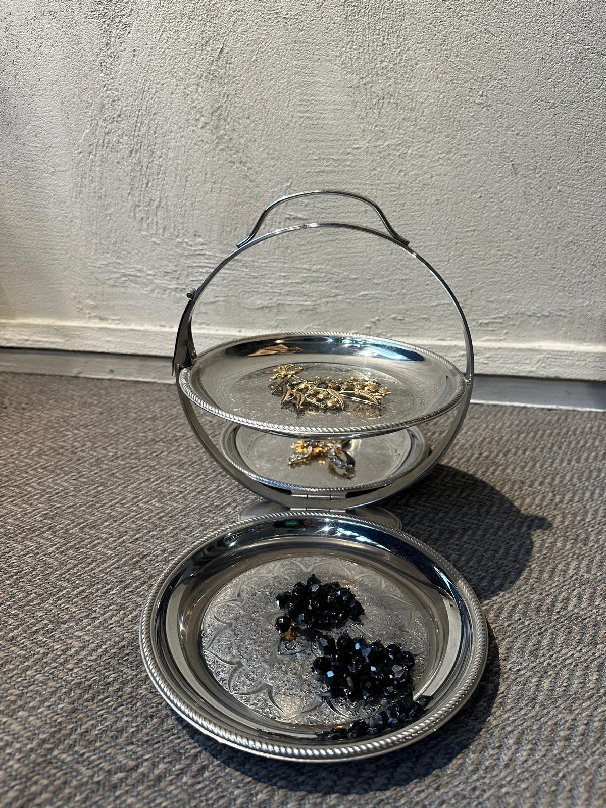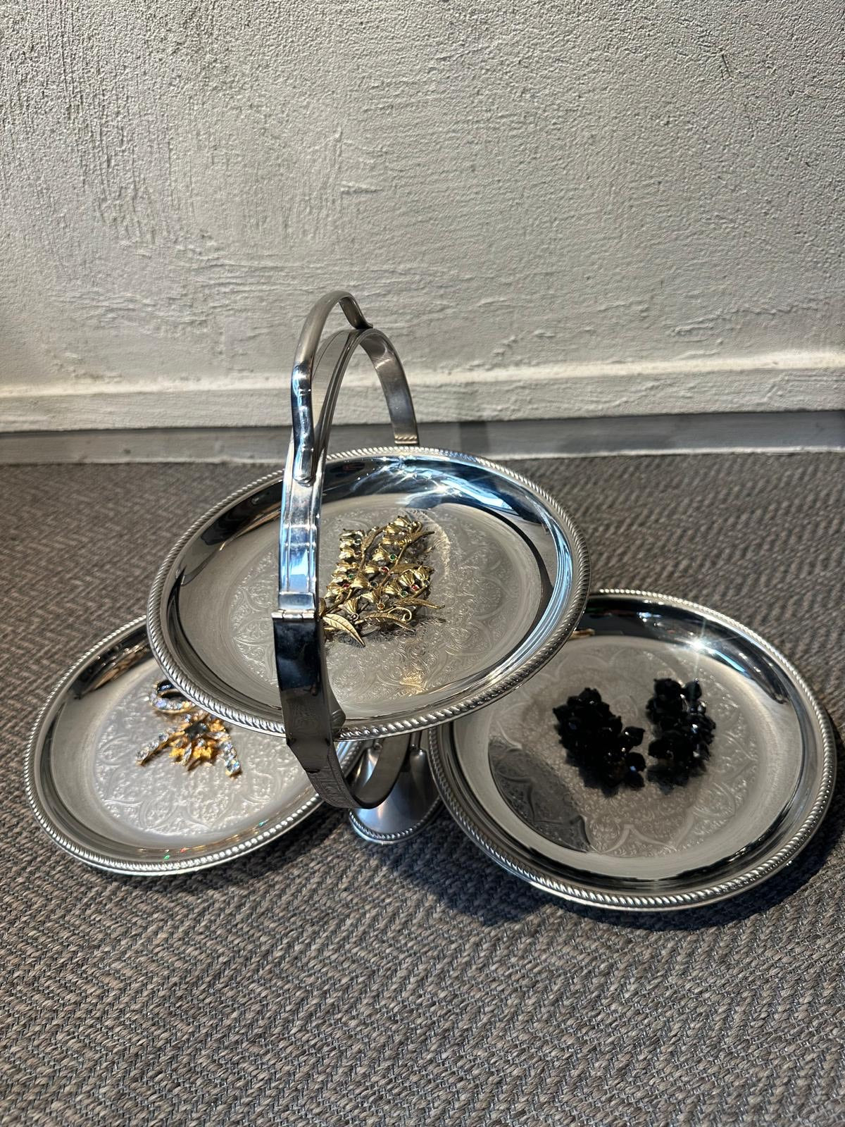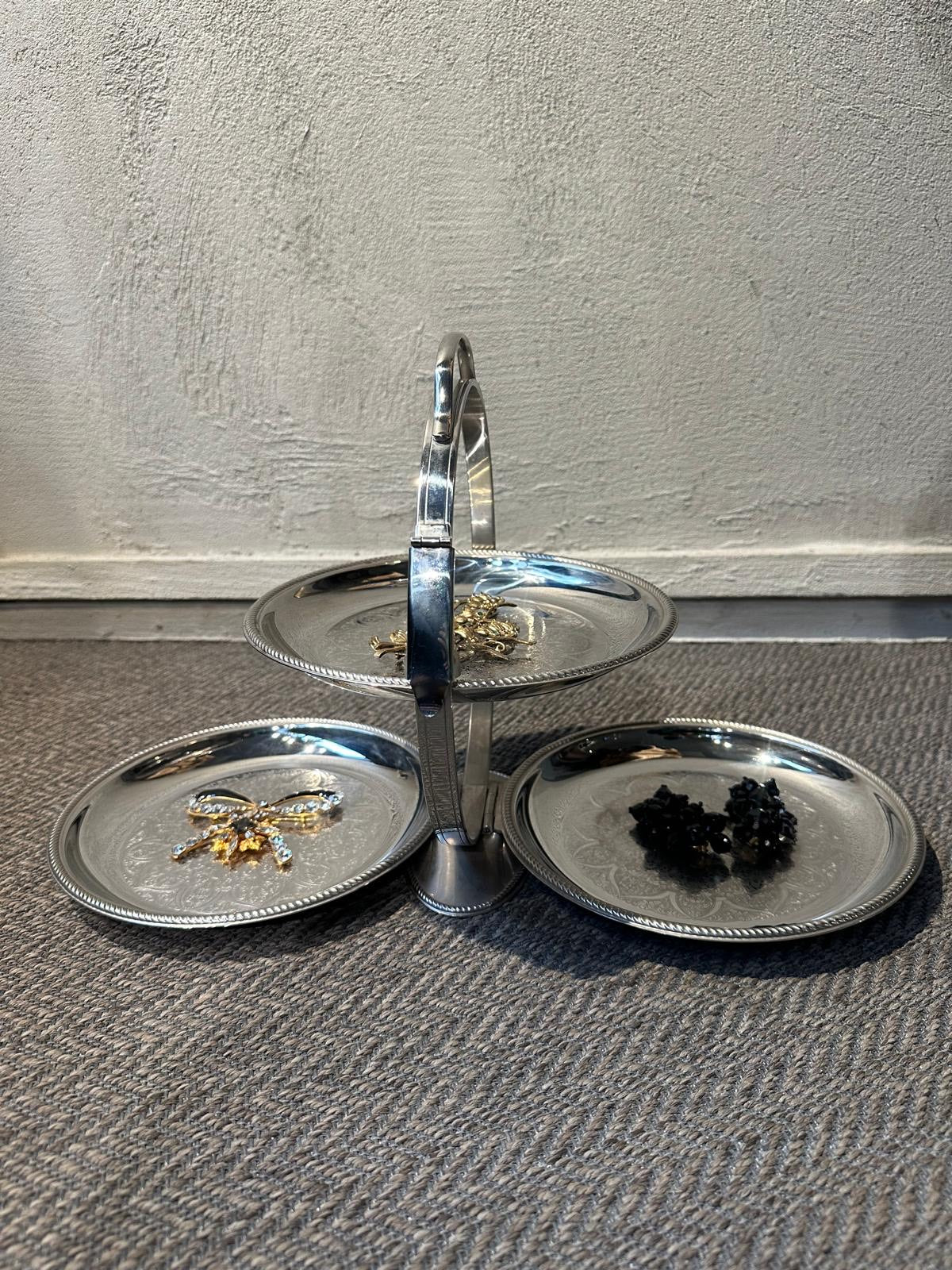 Beautiful and classic Alessi cake / tiered stand in steel. When open, it unfolds into three beautiful plates. It also features some lovely steel pattern and detailing. A home decor designer piece that will make your table look beautiful.