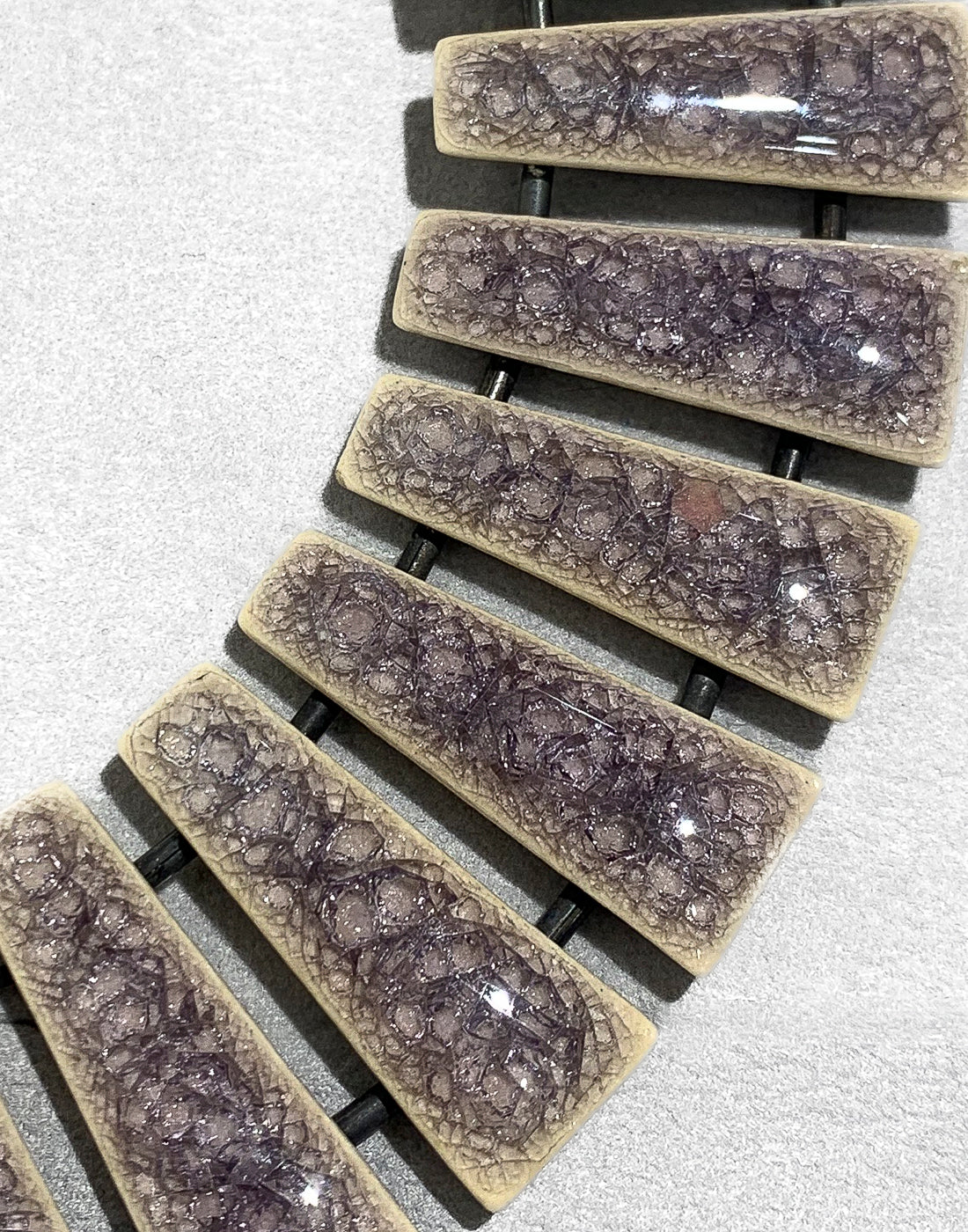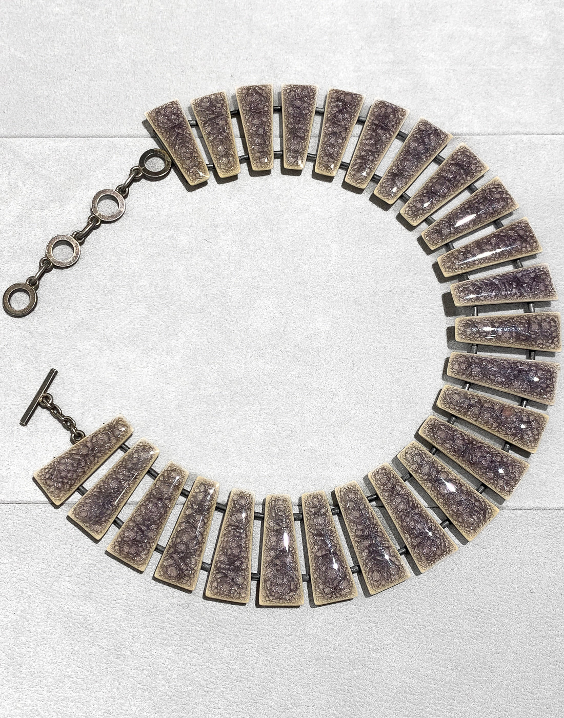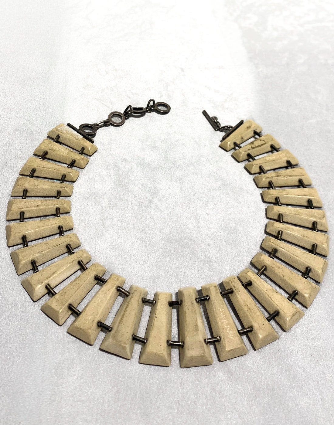 This is a rare and articulated necklace - made in Denmark - back in the 1950's. It's in Craquele' ceramic and silver punched sterling and it was published in 'Bijoux' (Mondadori) Milan in 1995. You could also wear it above a shirt or a top - adding a cool and elegant touch to your look.