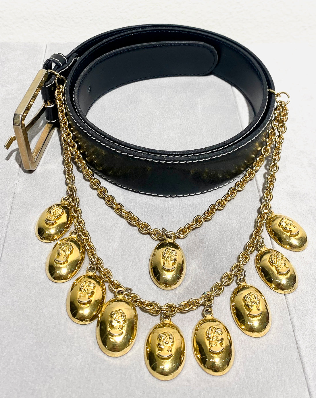 This is a unique and super cool piece designed by Roccobarocco and made in Italy. It's a leather belt featuring a beautiful chain with charms on it. It will add a very special touch to your look.