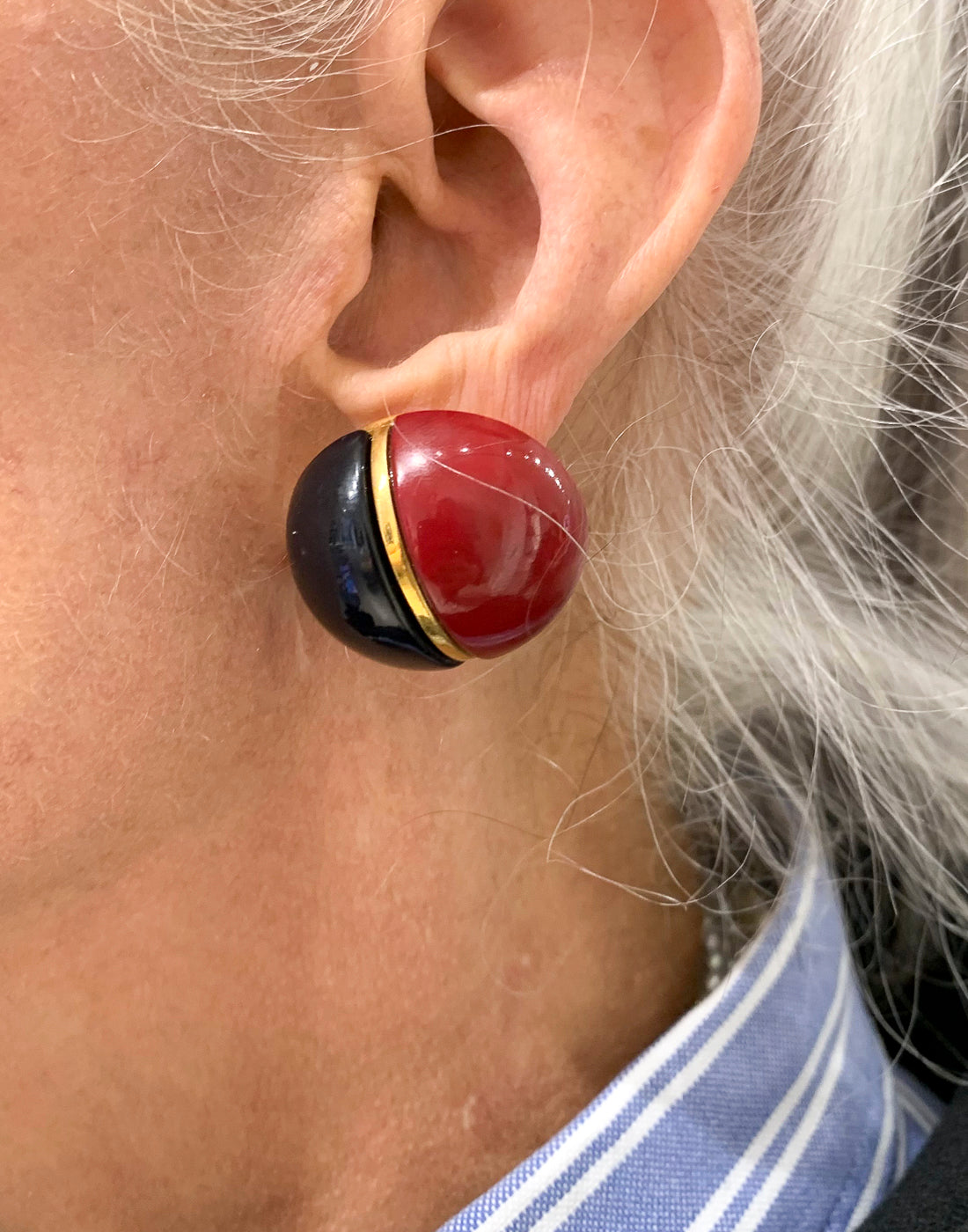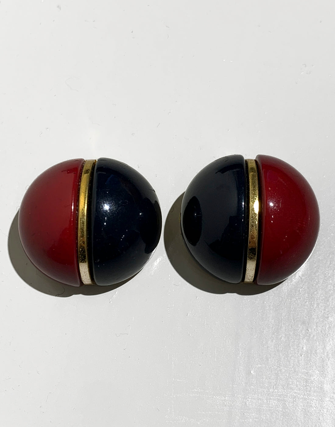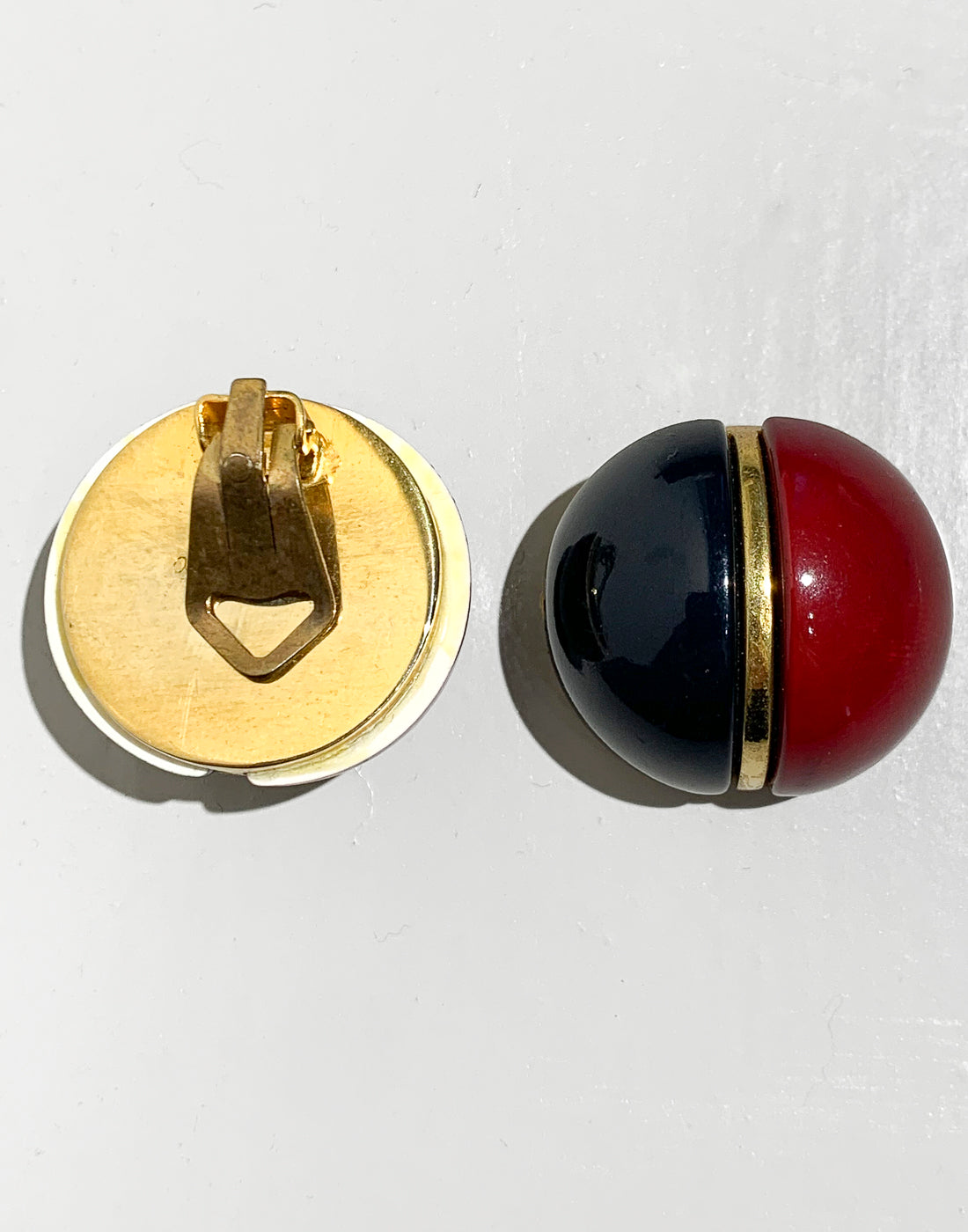 Really cool pair of clip-on earrings - attributed to Valentino - made by Coppola & Toppo in 1972. Gilded metal and two-tone plastic.