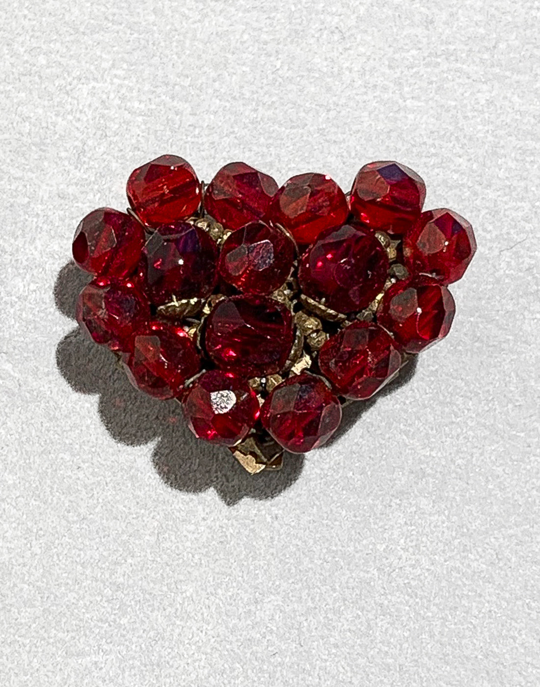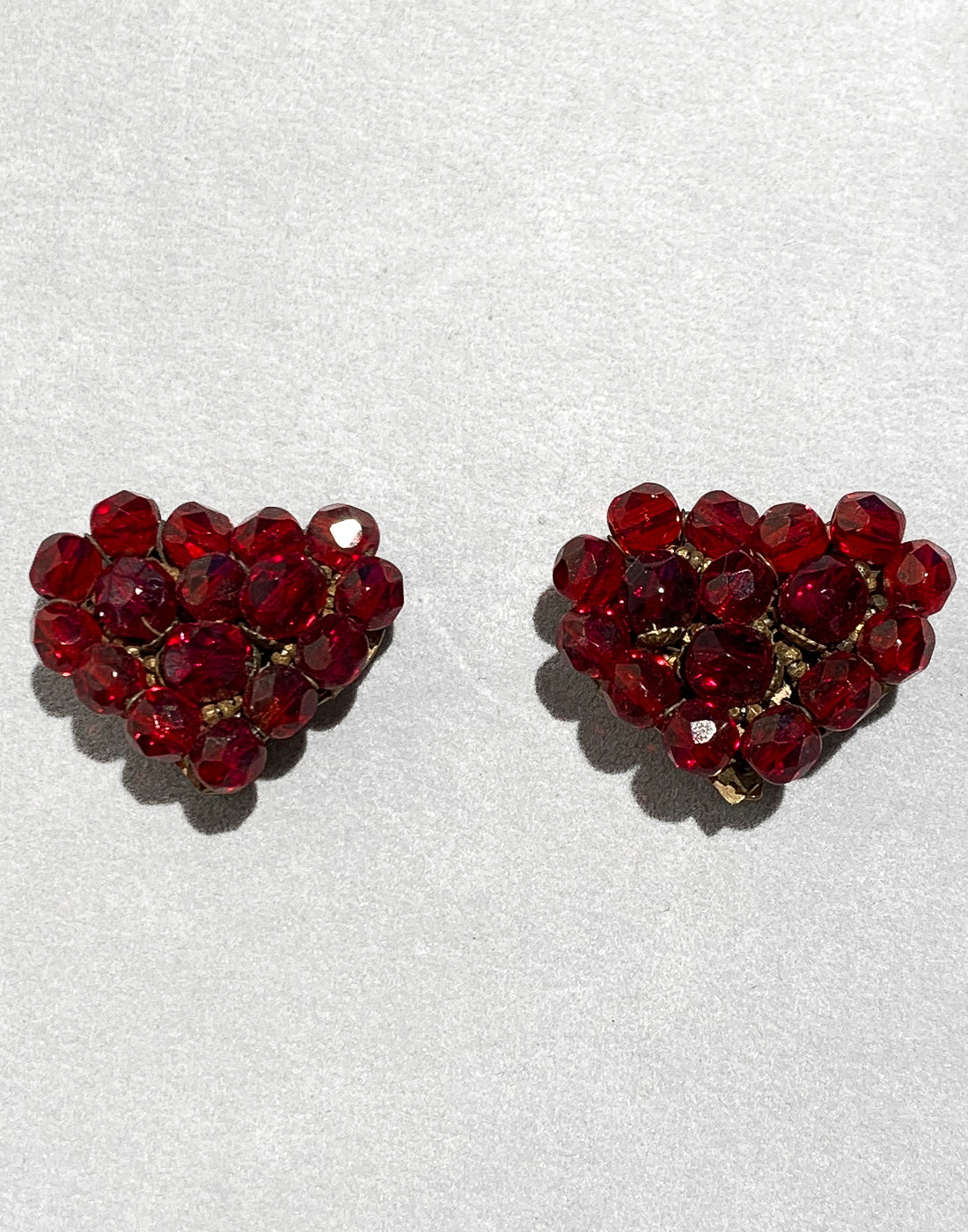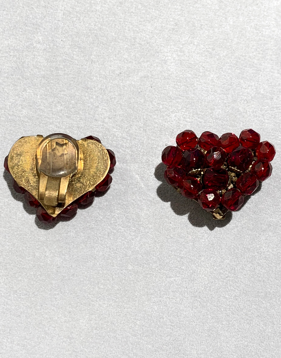 These are a beautiful and romantic pair of heart-shaped clip-on earrings designed by Coppola and Toppo. They are from 1950 - in fire-polished glass faceted beads embroidered on a gilded metal beading screen. Gorgeous deep and sparkly red.