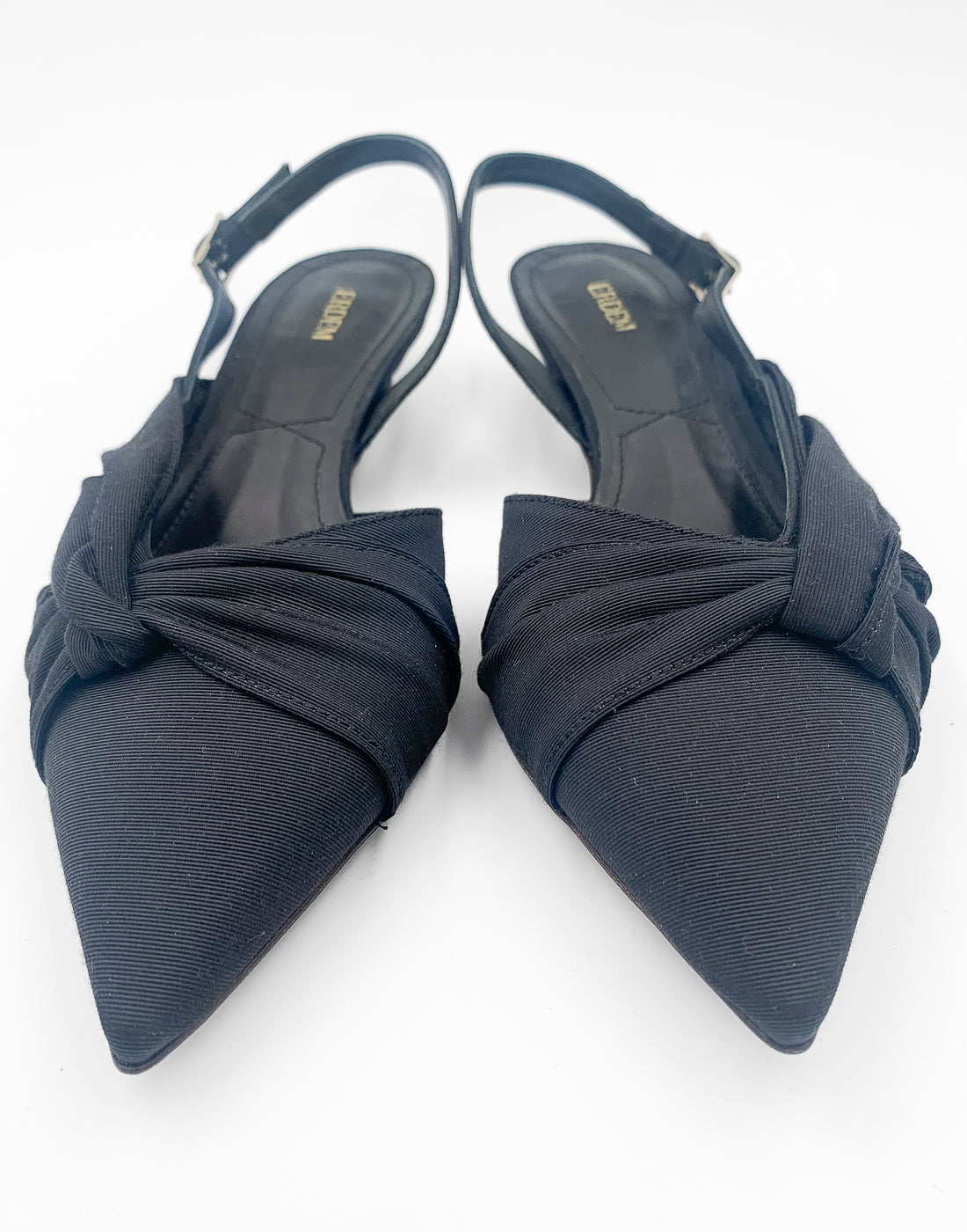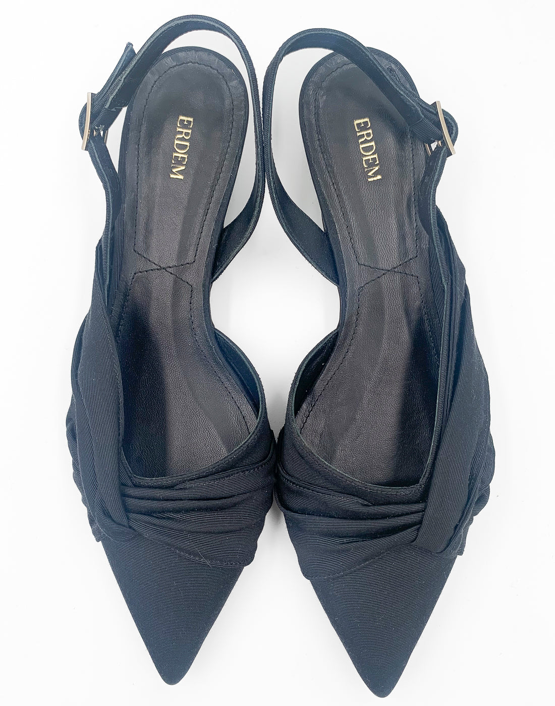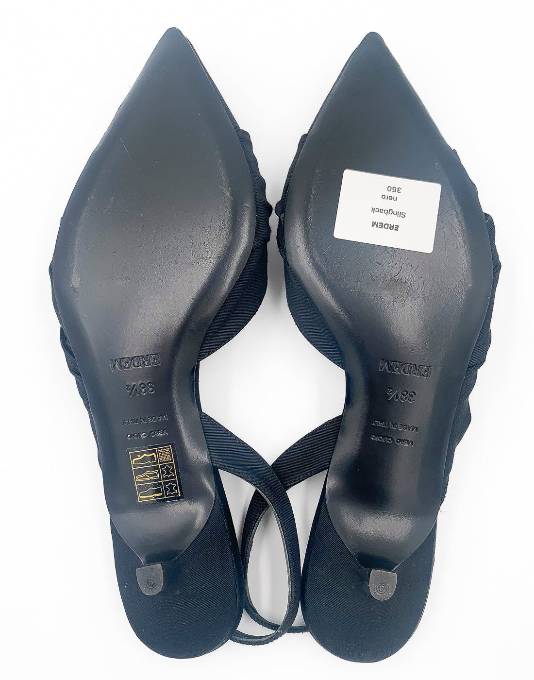 These are a pair of elegant and modern black slingback by Erdem. They feature a pointed toe, detailing across the front, small gold-tone buckle and a low heel. Feminine, refined and versitile.