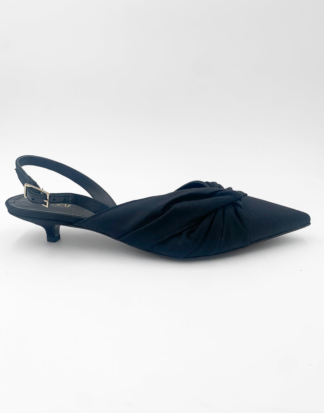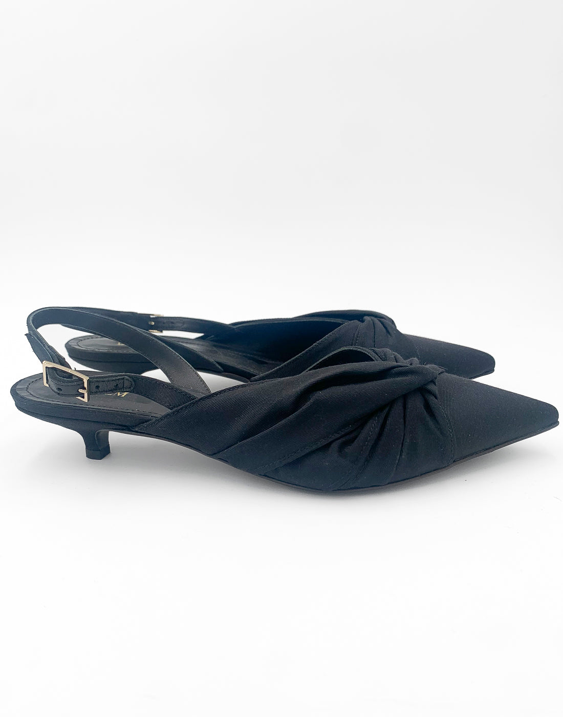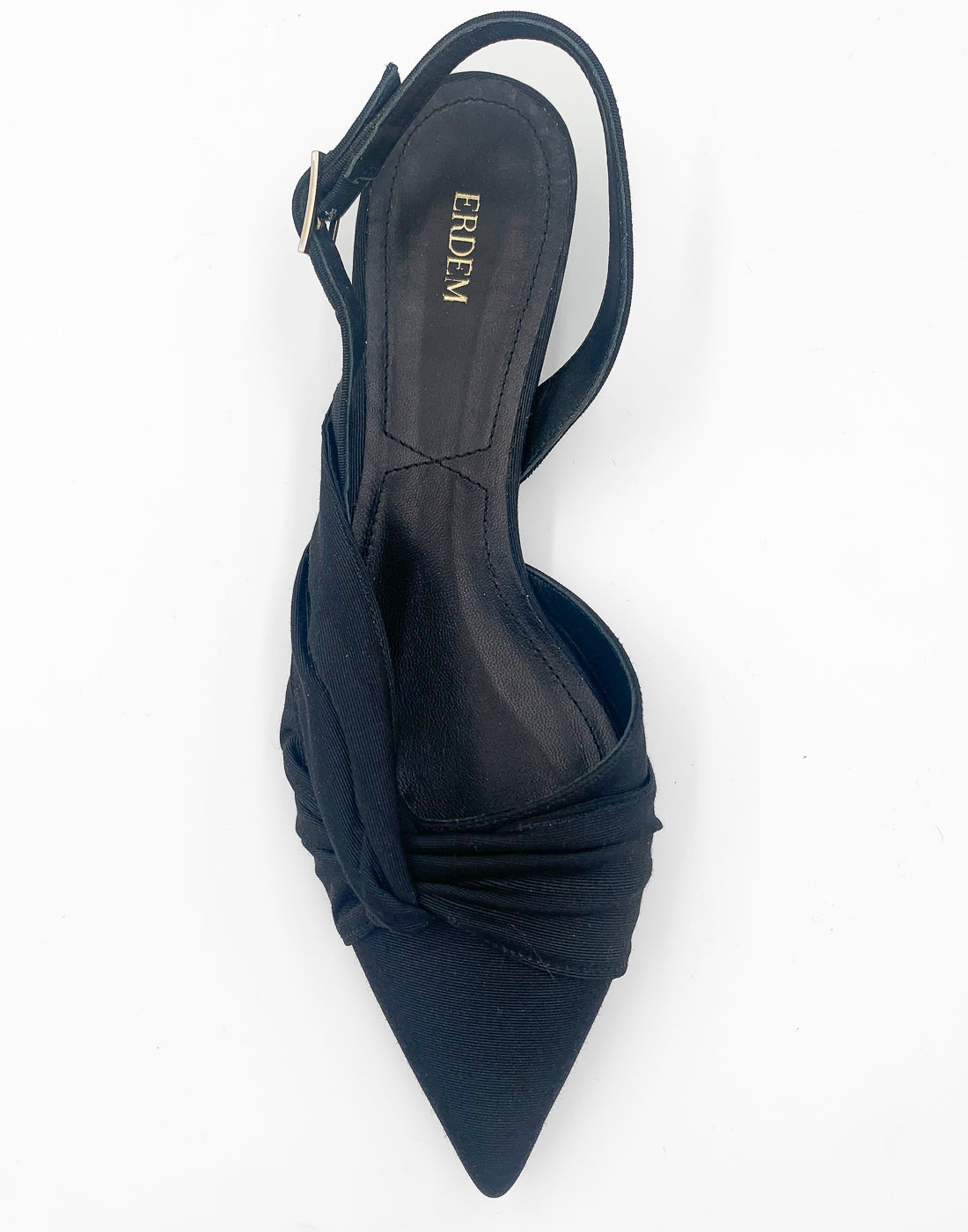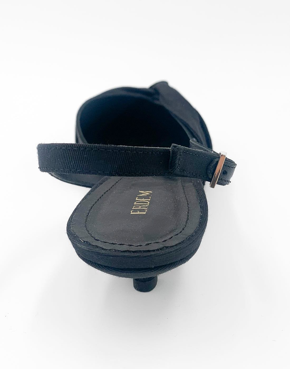 These are a pair of elegant and modern black slingback by Erdem. They feature a pointed toe, detailing across the front, small gold-tone buckle and a low heel. Feminine, refined and versitile.