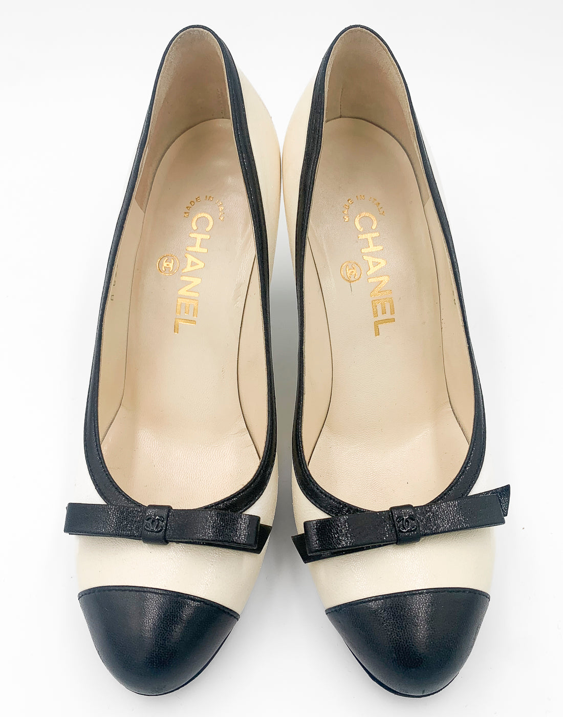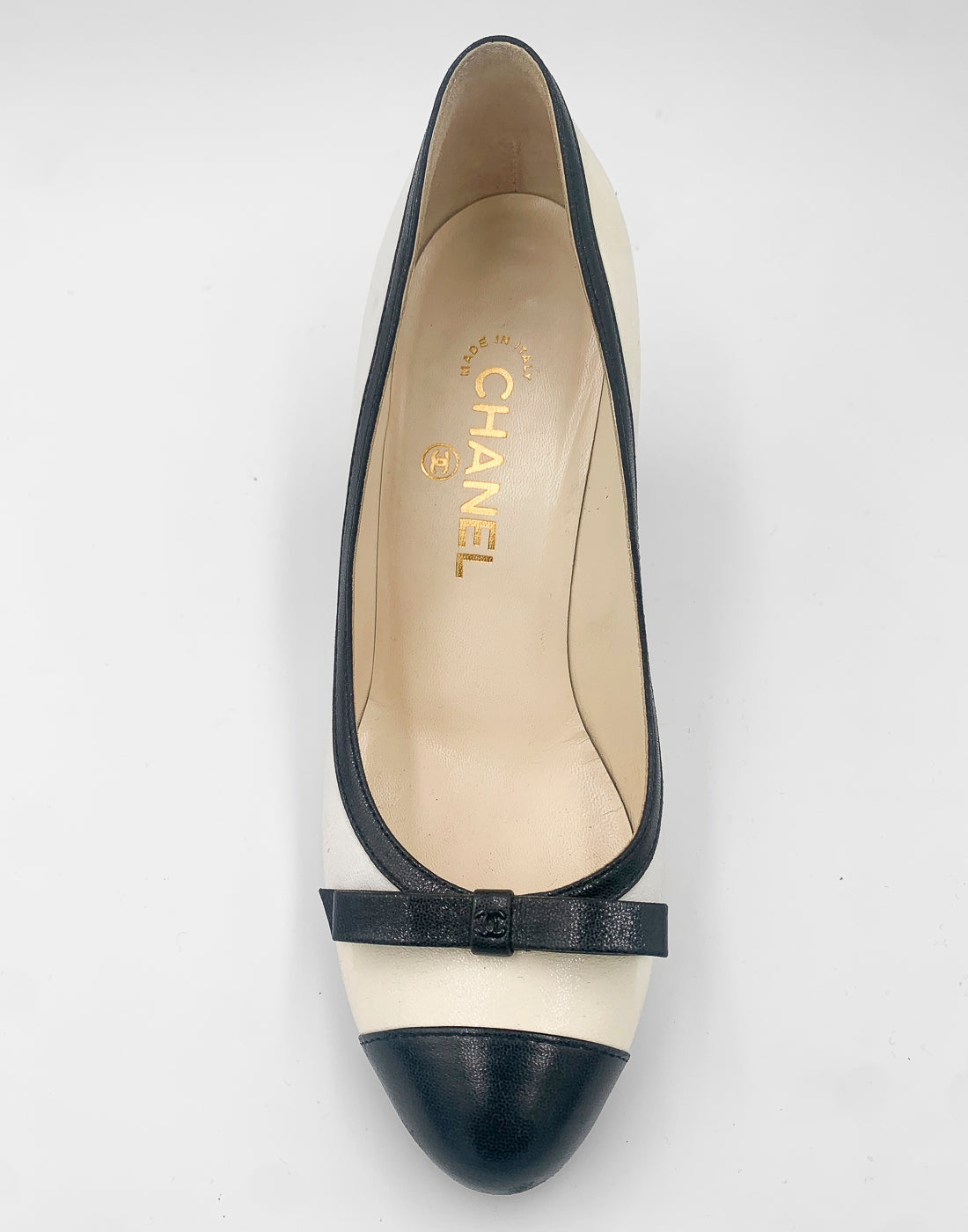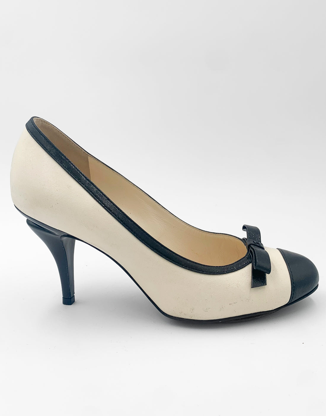 Classic Chanel two-tone pump in leather. Cream/off white leather matched with a contrasting black colour. It features a bow on the front, mid-height heel and a black trim along the opening. Also the heel has a special design (shown in the pictures).