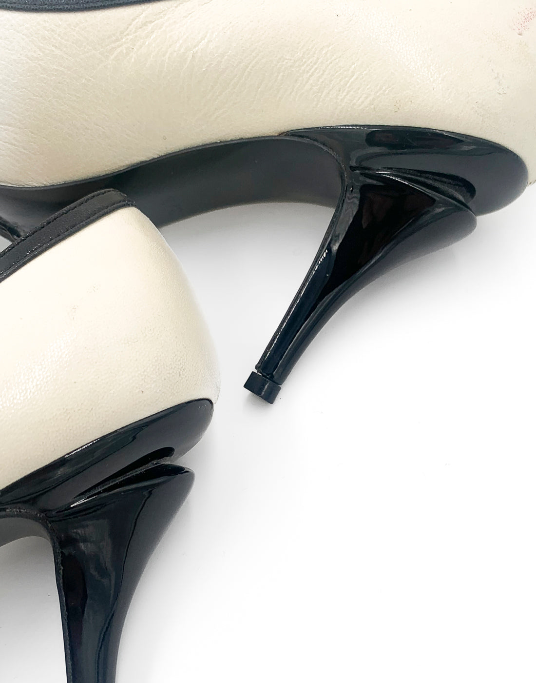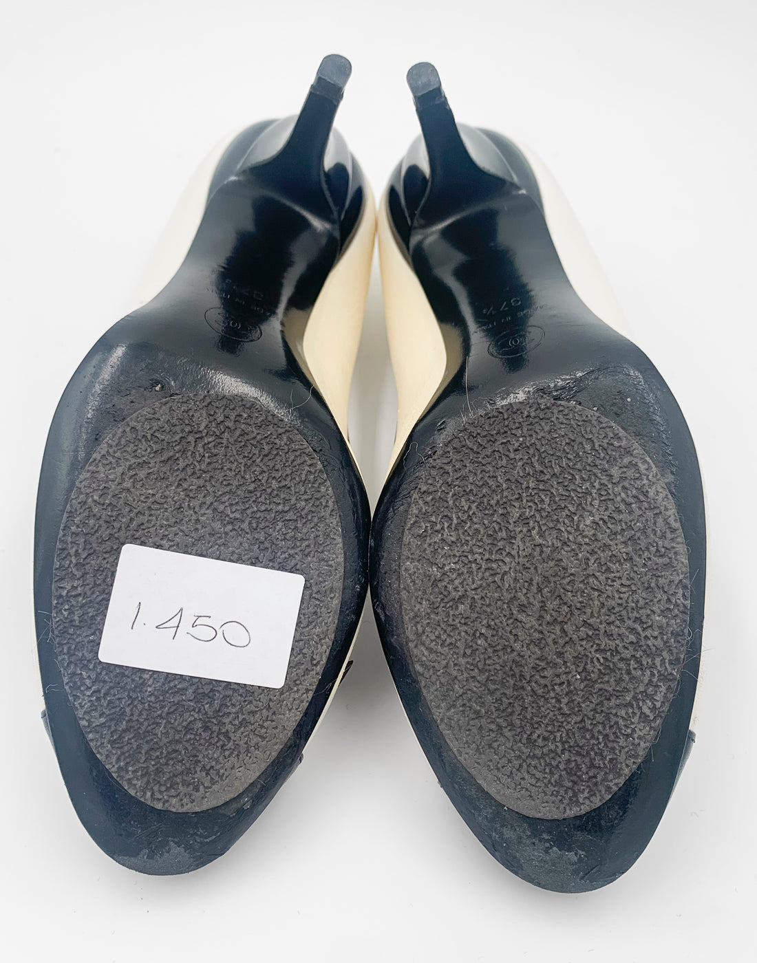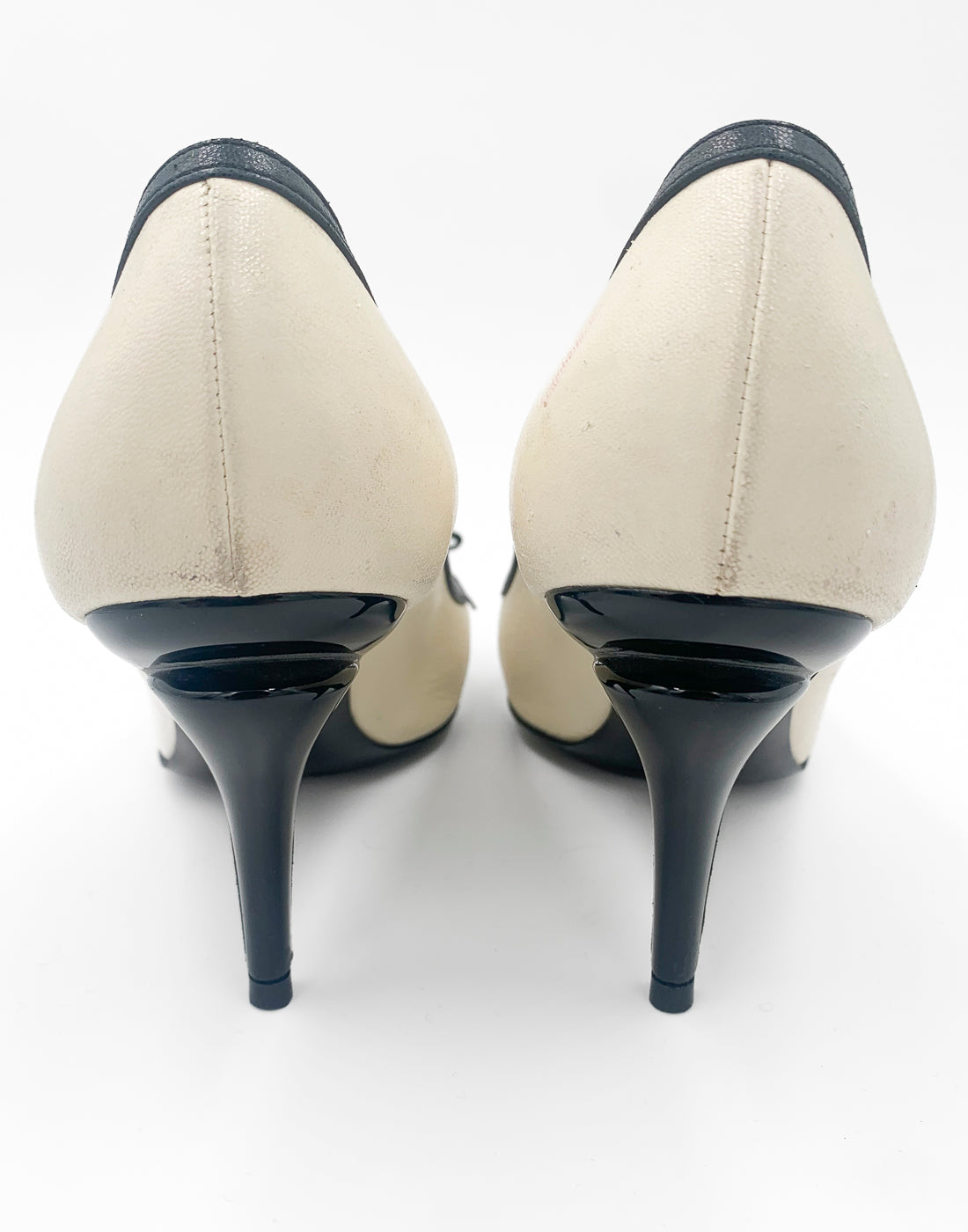 Classic Chanel two-tone pump in leather. Cream/off white leather matched with a contrasting black colour. It features a bow on the front, mid-height heel and a black trim along the opening. Also the heel has a special design (shown in the pictures).