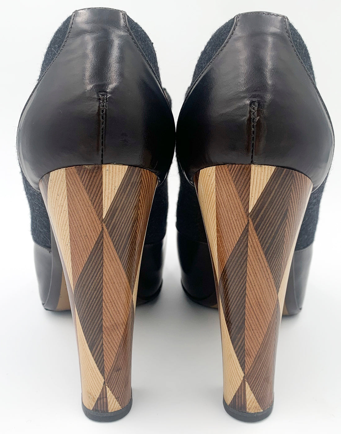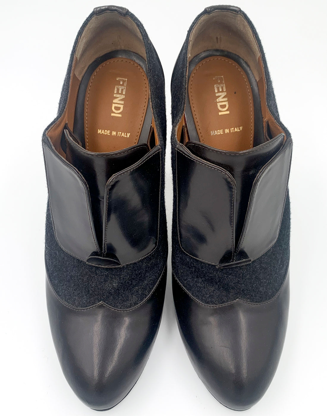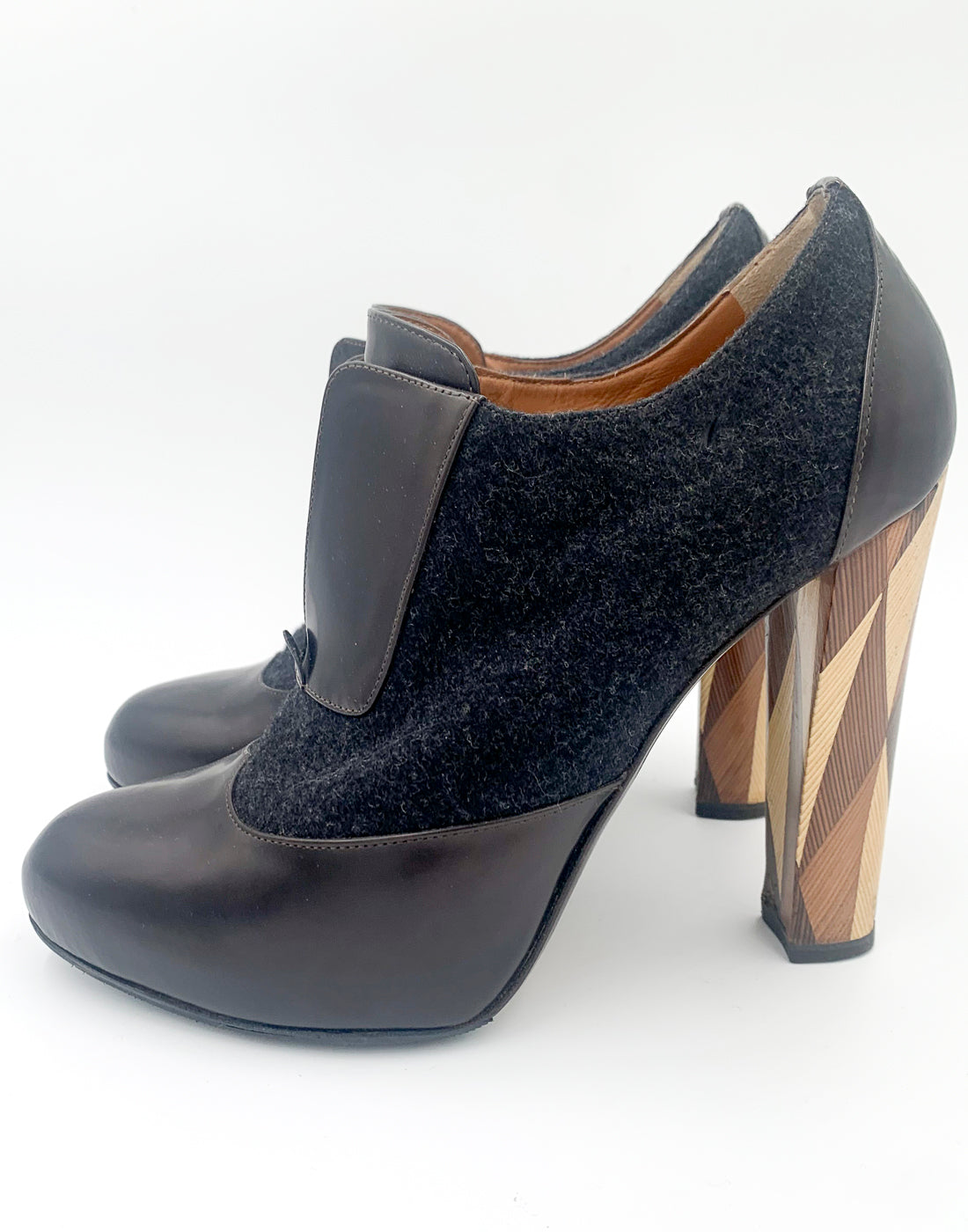 These are a cool and unique pair of Fendi pumps in brown leather and black inserts detailing. The heels definitely make them a statement pair.