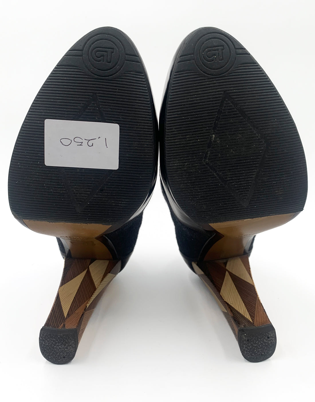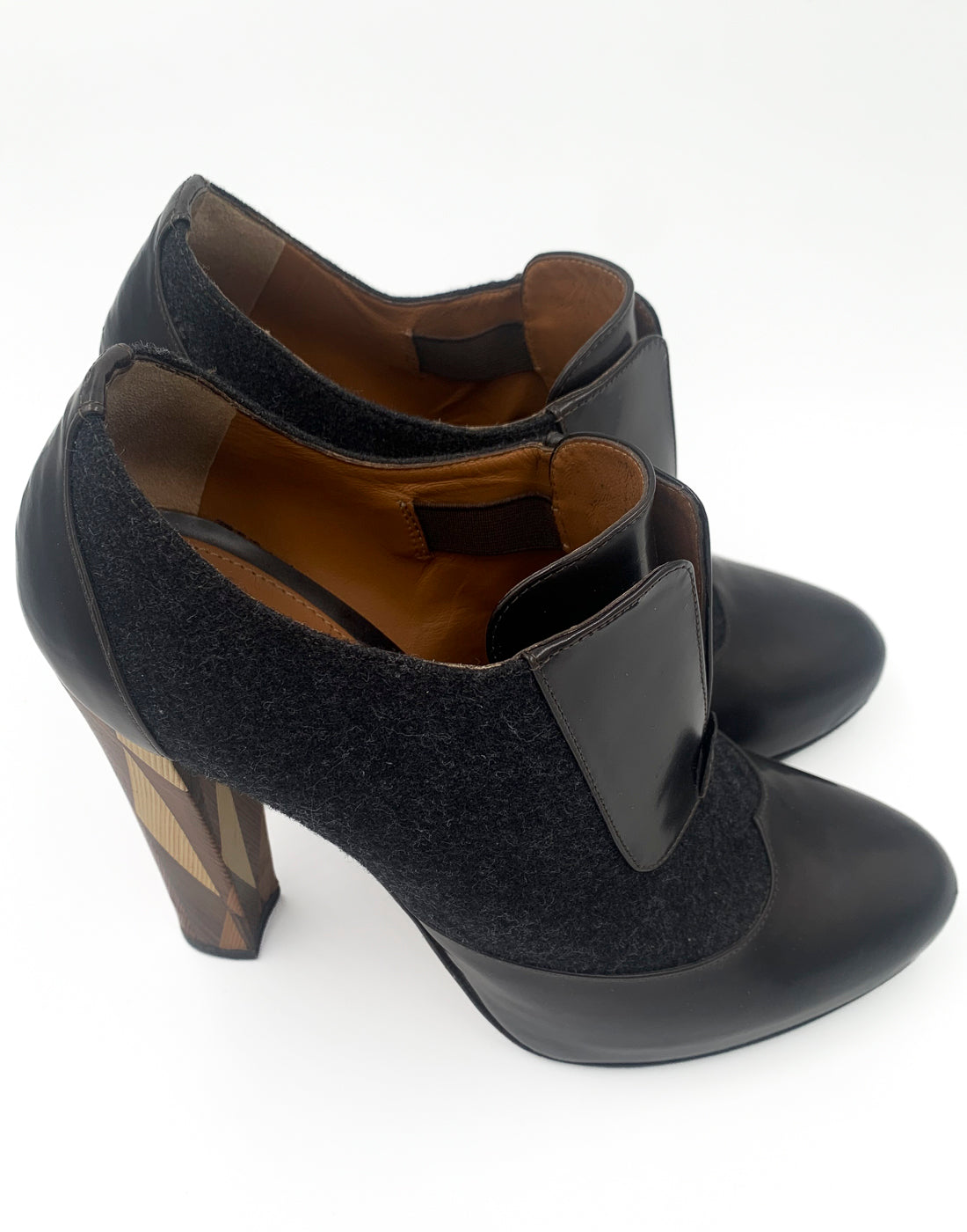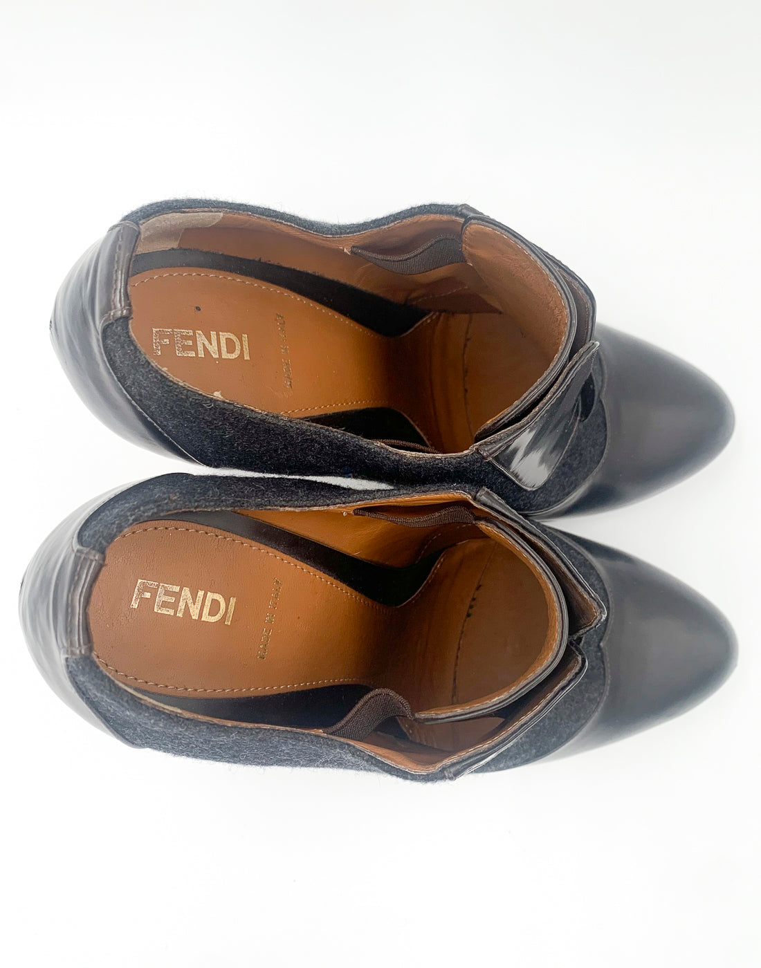 These are a cool and unique pair of Fendi pumps in brown leather and black inserts detailing. The heels definitely make them a statement pair.